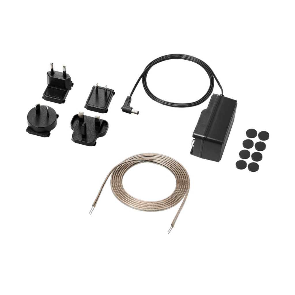 - Incluye un adaptador de CA con cuatro adaptadores de enchufe internacionales y un cable de 2,0 m para conectar el parlante pasivo con el parlante activo.