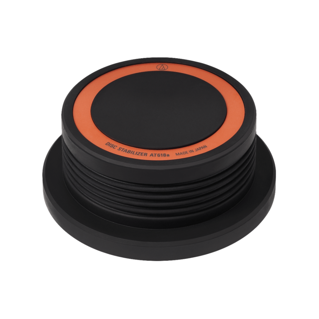 El estabilizador de discos AT618a se ajusta sobre el eje del tocadiscos para sujetar con firmeza los discos, lo que reduce la resonancia y mejora la calidad el sonido. Está fabricado de latón maquinado y cuenta con una cubierta de caucho protectora.