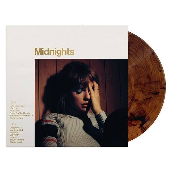 LP Edición caoba. El álbum de estudio de Taylor Swift de 2022, Midnights, es una colección de música escrita en medio de la noche, un viaje a través de terrores y dulces sueños. Los pisos que caminamos y los demonios que enfrentamos las historias de 13 noches de insomnio dispersas a lo largo de la vida de Taylor.